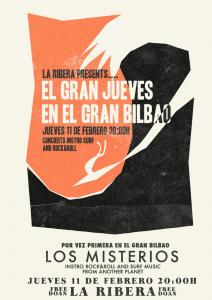 Los Misterios, el único grupo de surf music e instrorock&roll que viaja en el espacio aterrizará en La Ribera Bilbao para dar a conocer sus flamantes acordes lunares y armonías plutónicas. Es su primera vez en Bilbao y saben que el nivel es muy alto. Un equipo de músicos, que como el Athletic, está formado por la cantera de la tierra, con unos delanteros Fender inigualables, un portero Hammond que no deja pasar una y un batería con la mejor pegada de toda la costa norte. Además, gratis, como el amor. Traer parafina porque esperamos una noche muy movida!